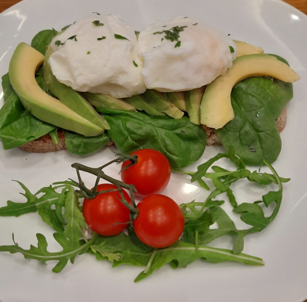 - Poached eggs on a bed of sliced avocado & baby spinach